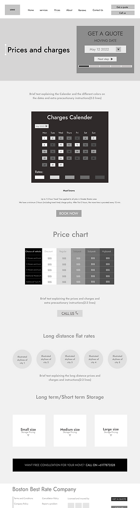 The page aimed to categorize services and display prices efficiently. It featured a calendar showing moving rates and fees, with a table detailing costs for each rate.